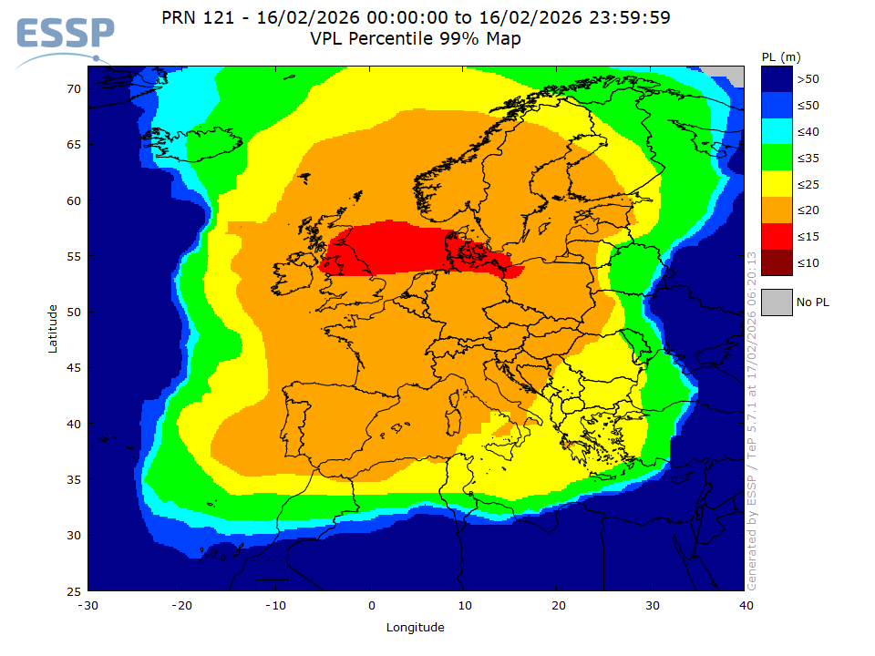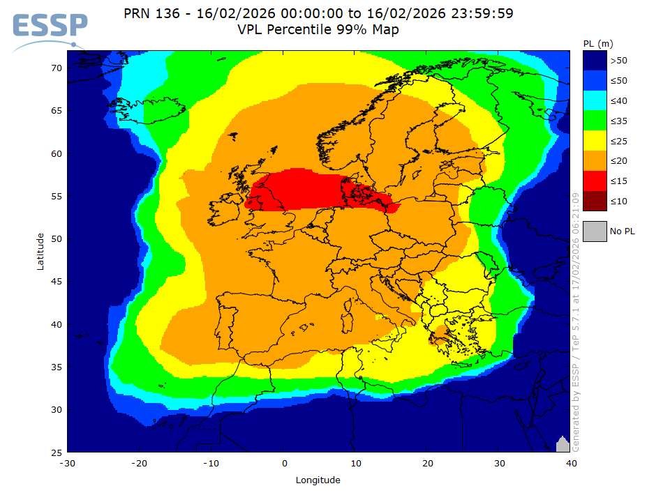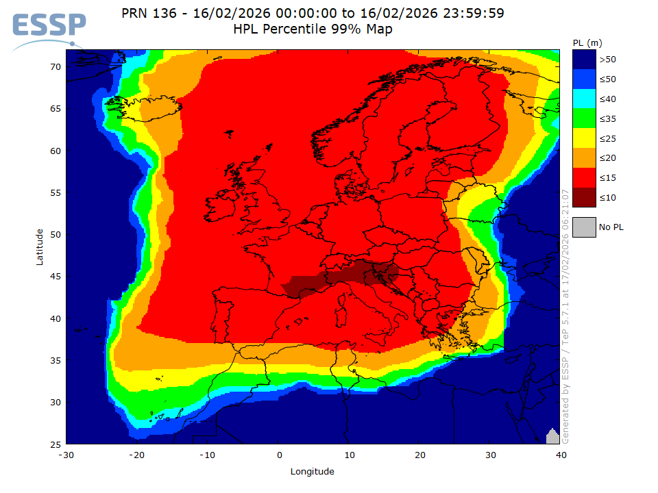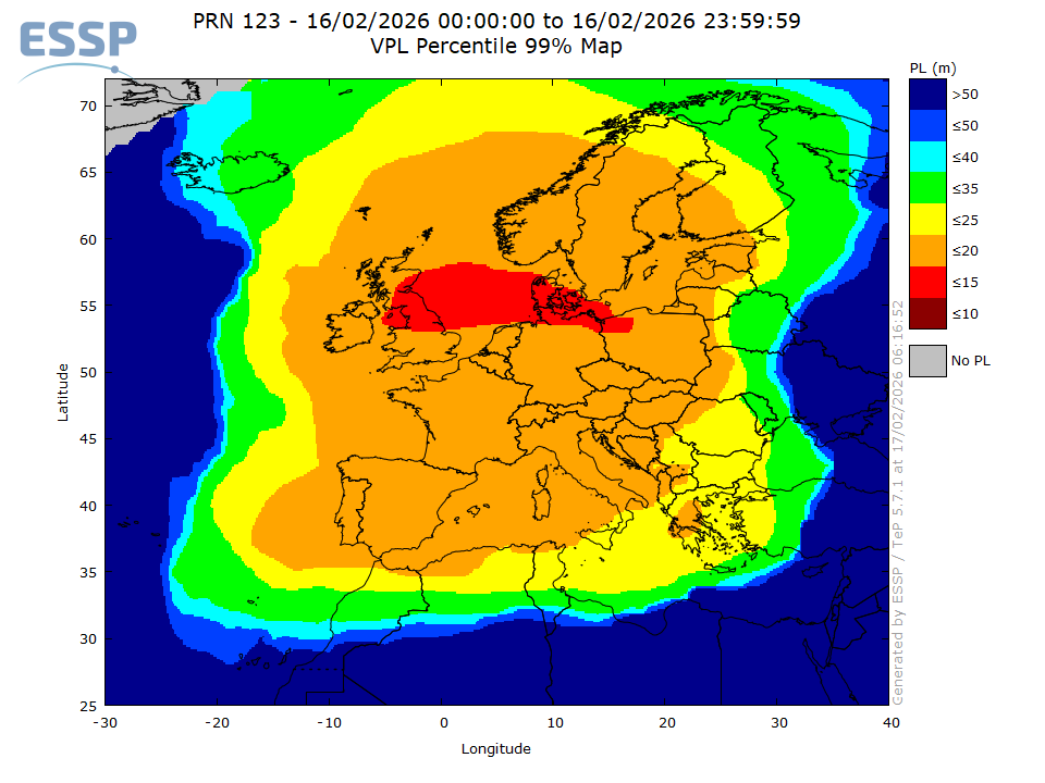 The Horizontal Protection Level (HPL) is the radius of a circle in the horizontal plane, with its centre being at the true position, which describes the region assured to contain the indicated horizontal position. The Vertical Protection Level (VPL) is the half length of a segment on the vertical axis with its centre being at the true position, which describes the region assured to contain the indicated vertical position. In other words, the HPL bounds the horizontal position error with a confidence level derived from the integrity risk requirement. Similarly, the VPL bounds the Vertical Position Error. The figures present HPL and VPL over the selected day for the operational GEO satellites and their combination.